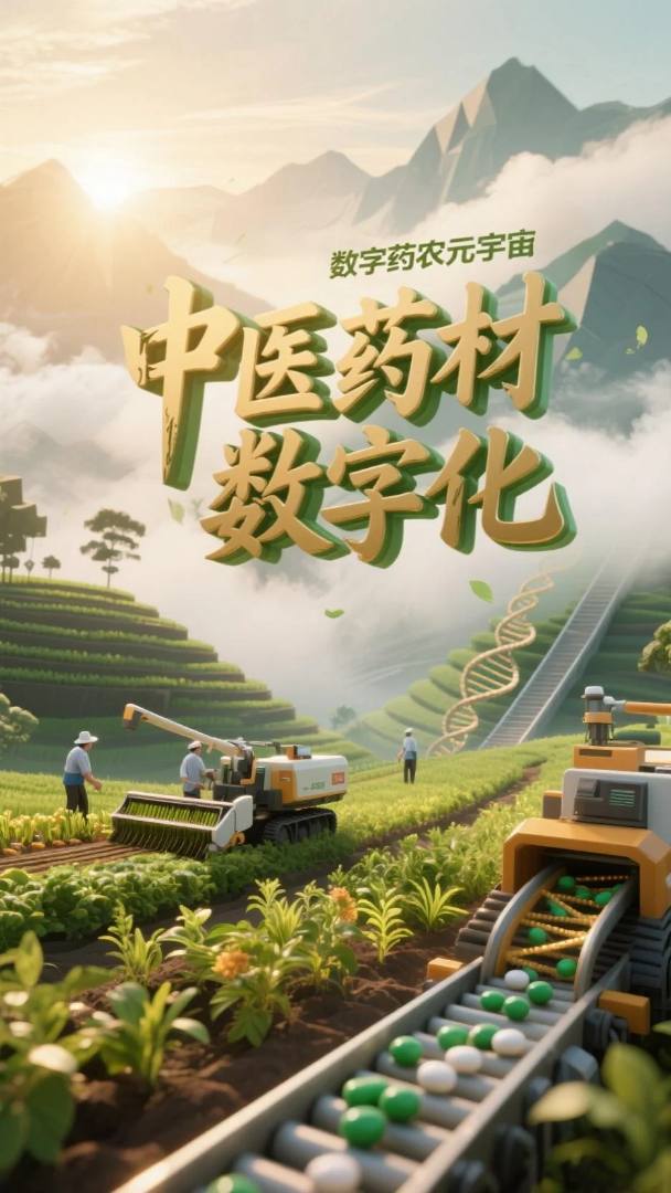 虚拟药农在数据田种植发光草药,收割机将DNA链转化为药丸,区块链梯田延展至天际,晨曦暖光穿透云层